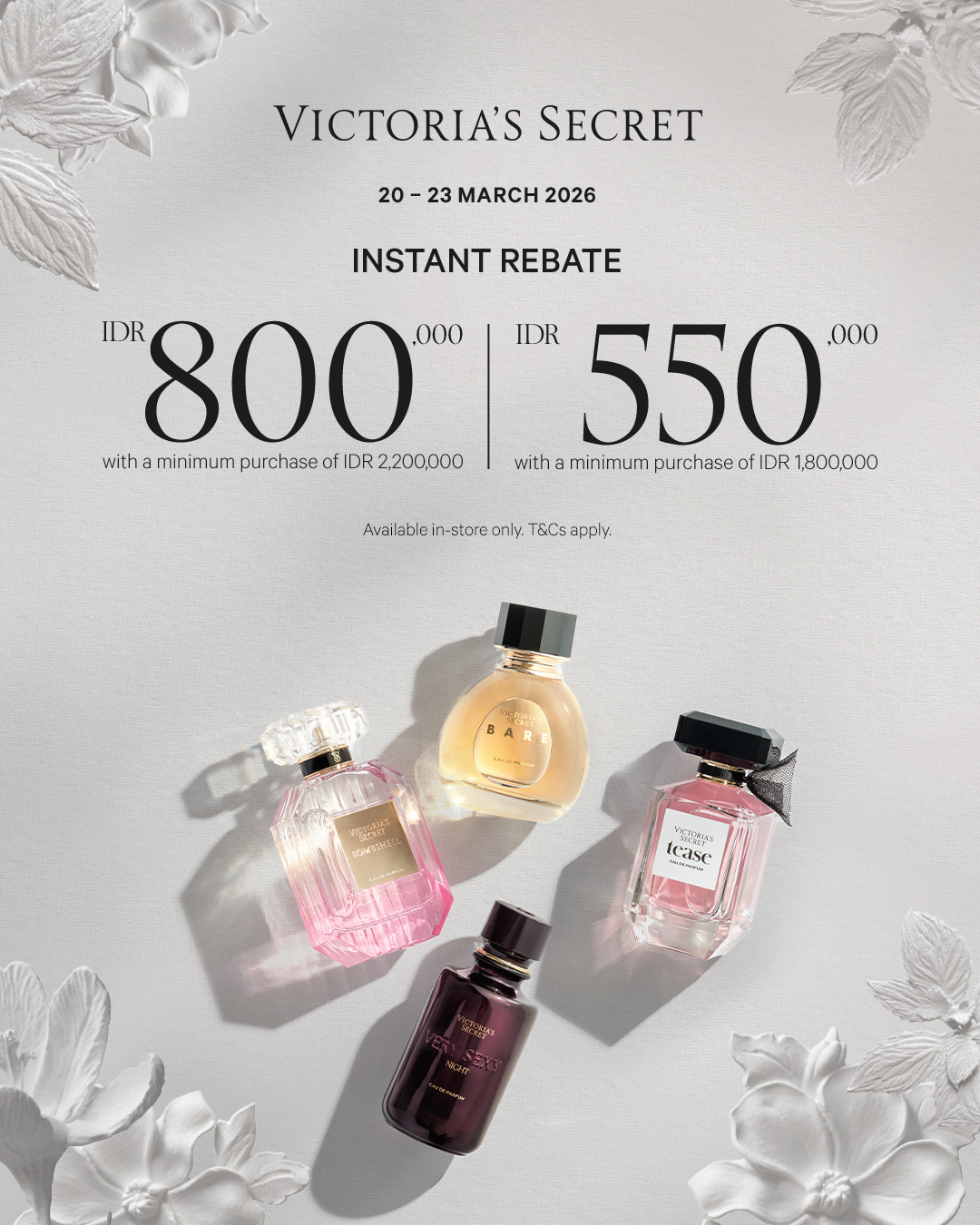 Enjoy IDR 800,000 rebate with a minimum purchase of IDR 2,200,000 or IDR 550,000 rebate with a minimum purchase of IDR 1,800,000 on Victoria’s Secret Eau de Parfum, along with selected beauty must-haves and accessories.